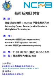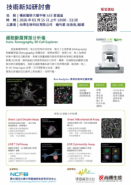 【時間】2026 年 01 月 15 日(星期四) 上午10:00-11:30 【地點】陽明校區 傳統醫學大樓甲棟五樓 R533 會議室 【講者】楊利君 技術長/副總 (尚博生物科技有限公司) 【報名...