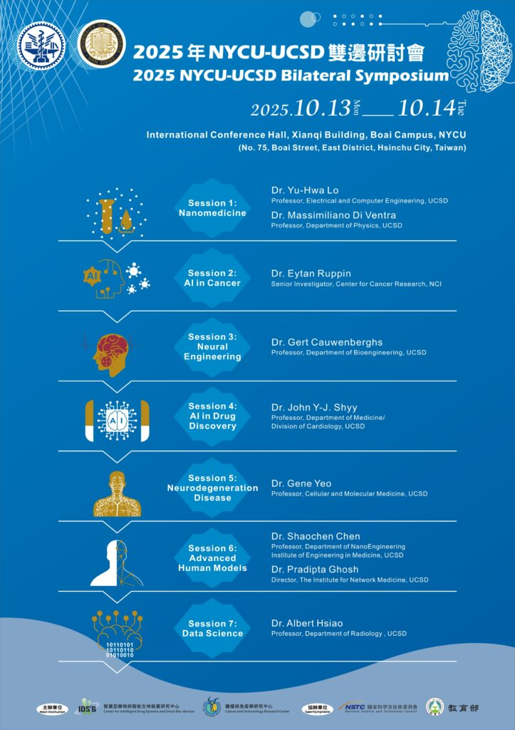 由 國立陽明交通大學智慧型藥物與智能生物裝置研究中心、腫瘤與免疫學研究中心 共同合辦之「2025 NYCU-UCSD Bilateral Symposium」,邀請多位 UCSD 學者分別以視訊及實體方式與陽明交大師生進行雙邊學術交流,本次更榮幸邀請到學術界翹楚-錢煦院士,以及陽明交大林奇宏校長為會議開幕致詞,機會難得,誠摯敬邀各位踴躍報名參加!